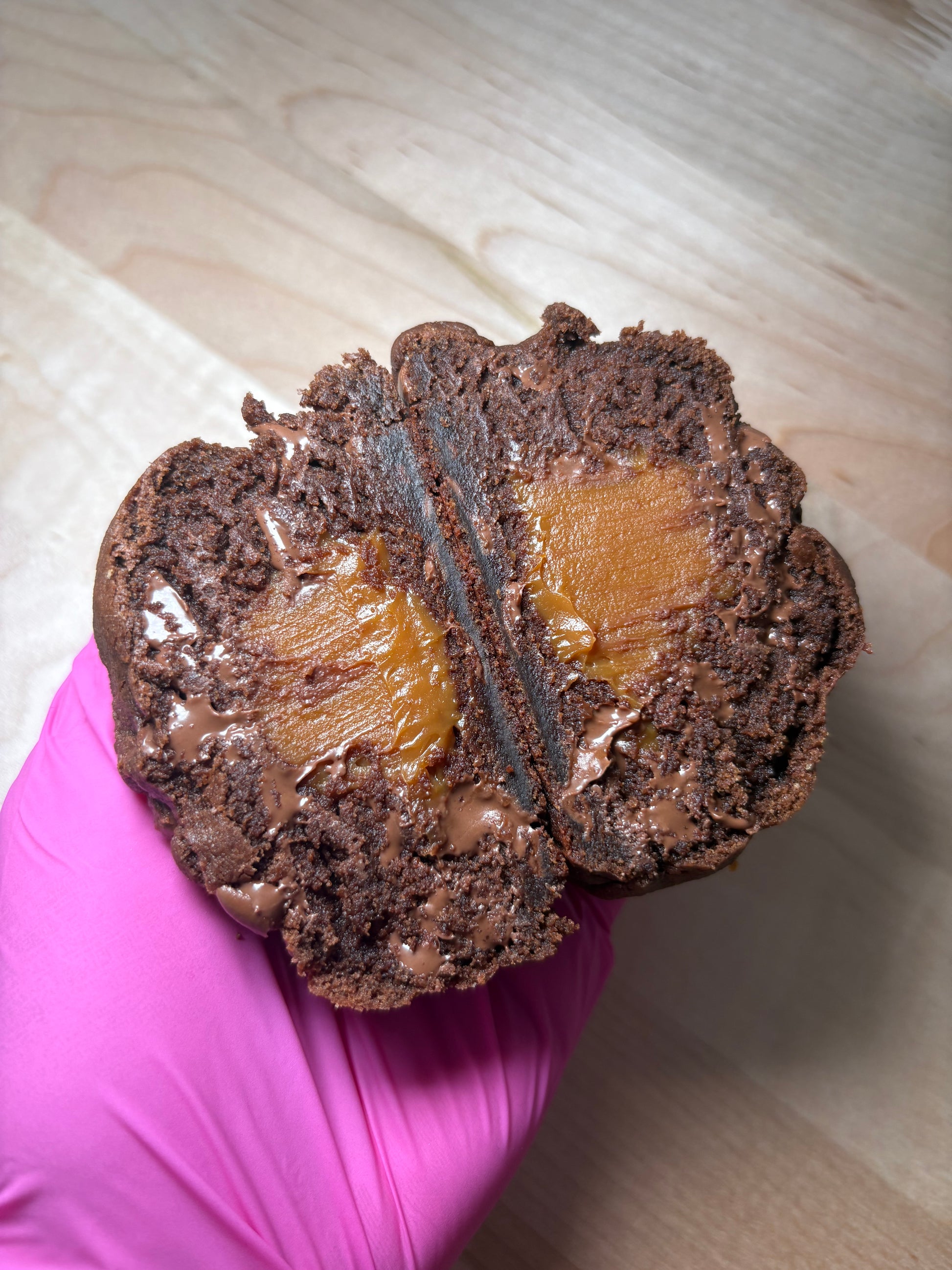 Una galleta extra soft de chocolate oscuro, con trozos de chocolate derretido en cada bocado y un corazón cremoso de dulce de leche que se desborda de sabor.